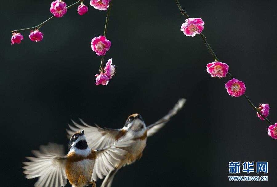 3月16日,在江苏省无锡市管社山庄,一对小鸟从盛开的梅花枝旁飞过。新华社发(潘正光 摄)