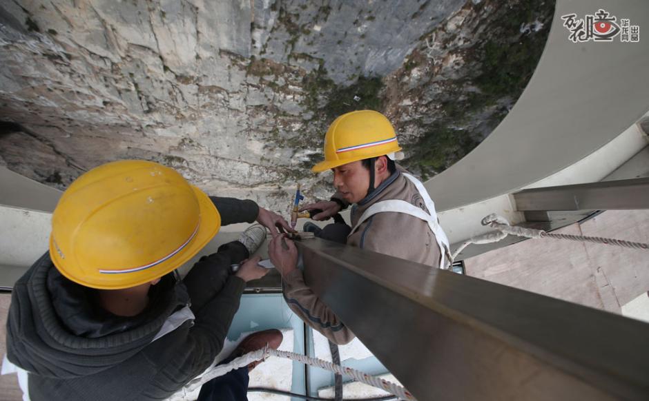 施工现场,工人们在做好防护措施后,将自己悬空吊在廊桥上,探出手去,挨个对玻璃廊桥的护栏进行安全检查,并安装玻璃护栏。 华龙网记者 黄宇 李文科 图片来源:华龙网