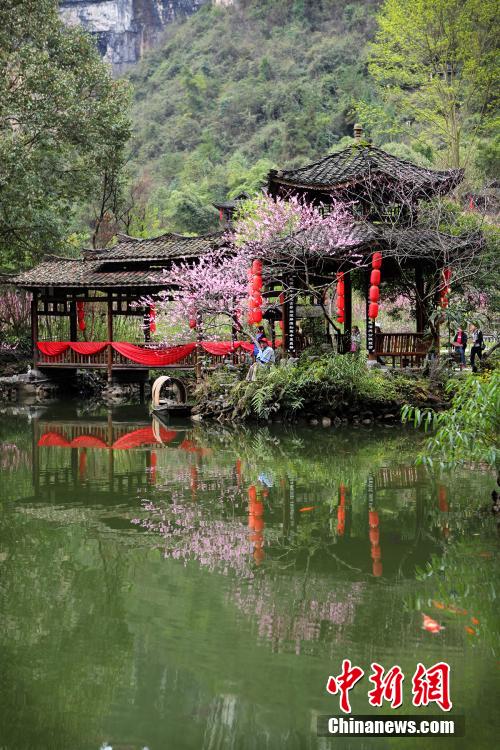 忽如一夜春风来,千树万树桃花开”。近日,地处武陵山深处的国家5A级旅游景区——重庆酉阳桃花源境内,粉色桃花竞相吐蕊,于山野葱郁间,点点花瓣随轻风漫卷起舞,再现田园诗人陶渊明笔下“芳草鲜美,落英缤纷”的“桃源”胜景。30日,桃源美景引来游人如织,不少汉服爱好者驻足留影。刘渝 摄