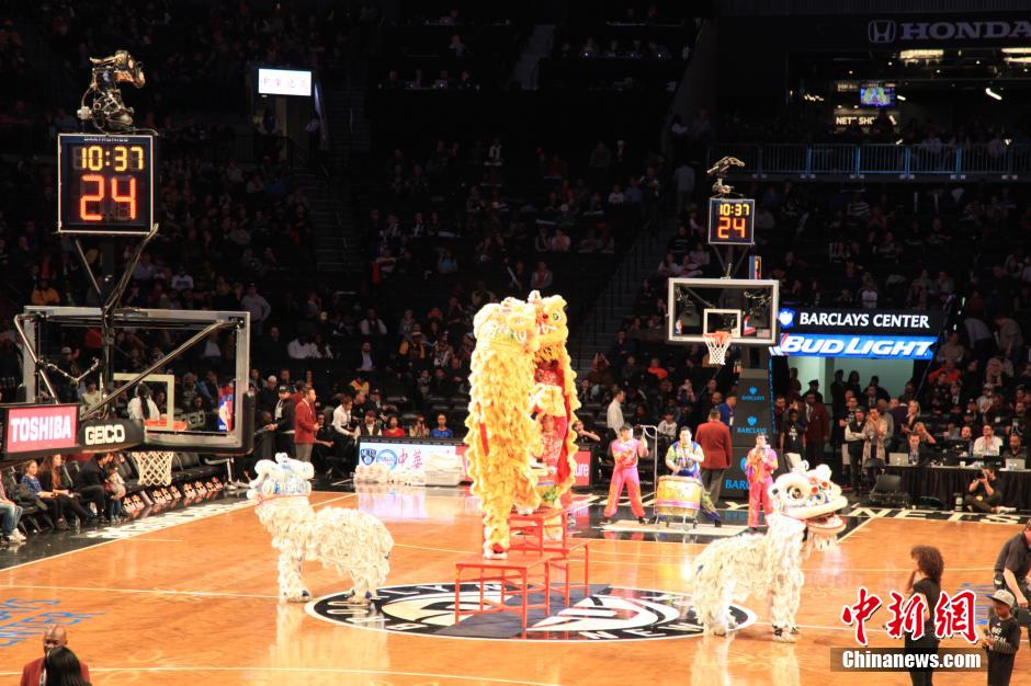 当地时间3月29日,第七届“中华之夜”文化盛会在纽约布鲁克林巴克莱中心登场。第七届“中华之夜”文化盛会由美中友好协会与NBA网队主办,当天观看NBA比赛的观众在欣赏比赛的同时体验富有中国特色的文化表演。图为第七届“中华之夜”上的舞狮表演。中新社发 阮煜琳 摄