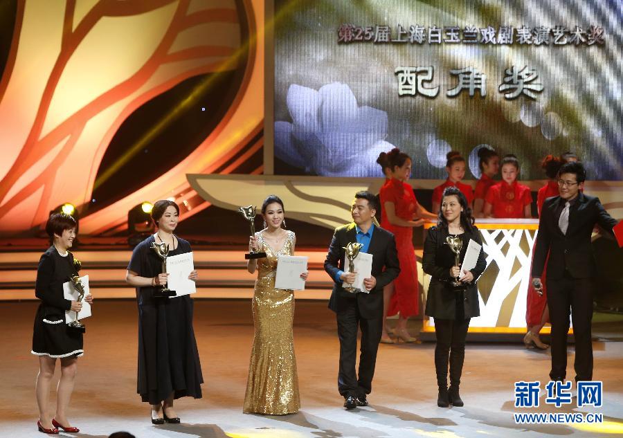 3月31日,获得“配角奖”的艺术家们在台上领奖。当日,第25届上海白玉兰戏剧表演艺术奖颁奖晚会在上海大剧院举行。来自全国49个剧团的144名演员参评本届“白玉兰”奖,最终产生“主角奖”8名、“配角奖”5名、“特殊贡献奖”1名等奖项。新华社记者 裴鑫 摄