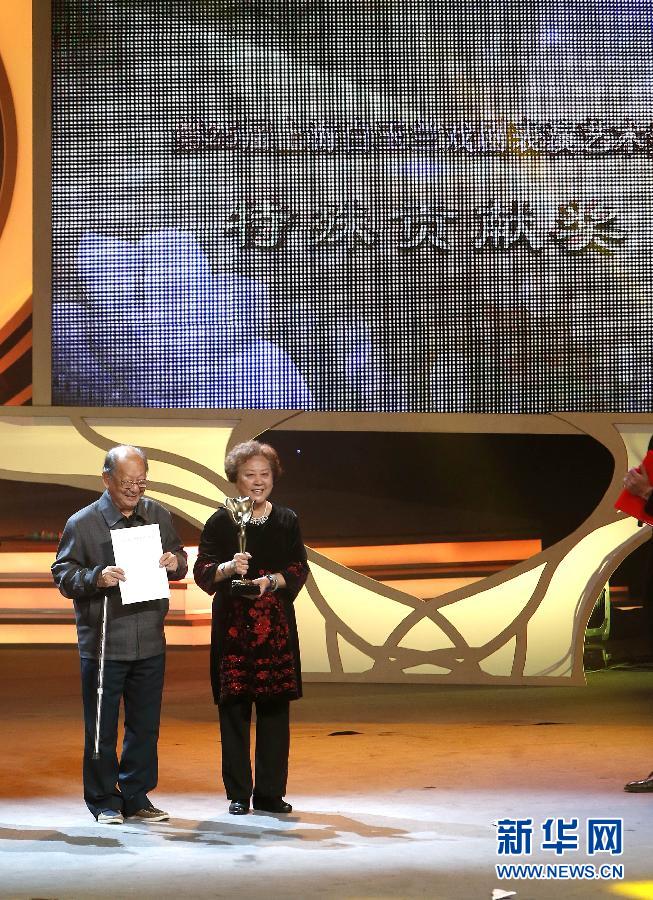 3月31日,获得“特殊贡献奖”的艺术家马科(左)与夫人在台上领奖。当日,第25届上海白玉兰戏剧表演艺术奖颁奖晚会在上海大剧院举行。来自全国49个剧团的144名演员参评本届“白玉兰”奖,最终产生“主角奖”8名、“配角奖”5名、“特殊贡献奖”1名等奖项。新华社记者 裴鑫 摄