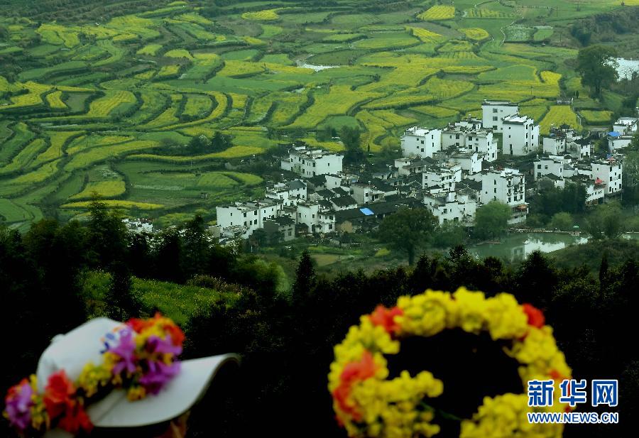 在婺源江岭景区,两位头戴花帽的游客在观景台处赏花(3月31日摄)。清明前夕,在江西省婺源县境内,层层梯田,油菜花海,蔚为壮观,吸引了大批游客前来踏青赏花。 新华社记者王颂摄
