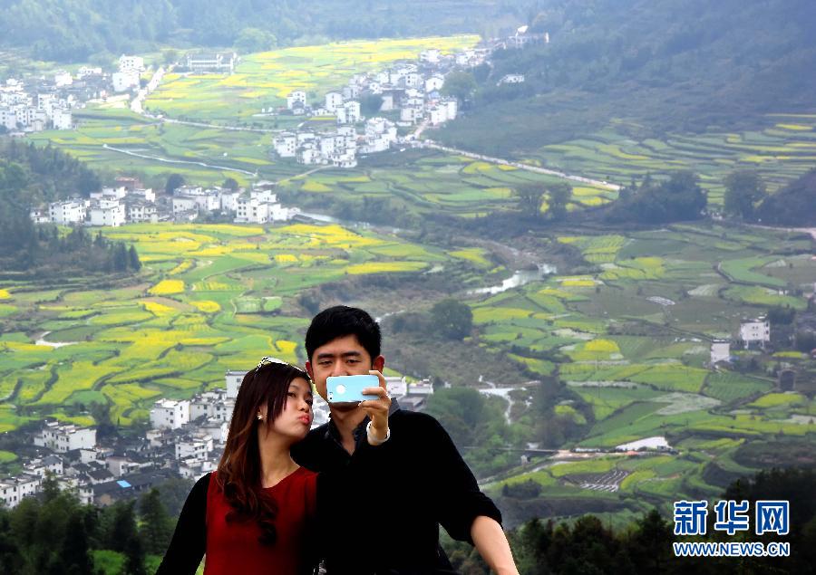在婺源江岭景区,一对情侣在自拍合影(3月31日摄)。清明前夕,在江西省婺源县境内,层层梯田,油菜花海,蔚为壮观,吸引了大批游客前来踏青赏花。 新华社记者王颂摄