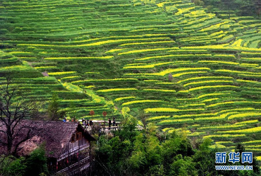 游客在婺源篁岭景区的一个观景点欣赏美景(3月31日摄)。清明前夕,在江西省婺源县境内,层层梯田,油菜花海,蔚为壮观,吸引了大批游客前来踏青赏花。 新华社记者王颂摄