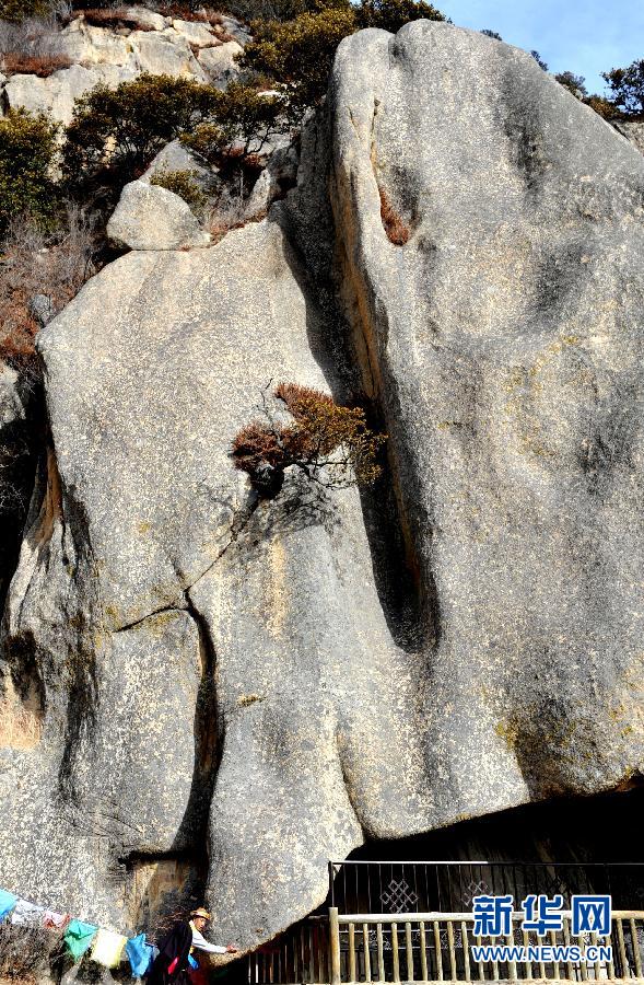 这是在西藏林芝地区工布江达县太昭村唐蕃古道遗址中拍摄的肺崖洞(又称牛肺石)(3月24日摄)。在西藏林芝地区工布江达县太昭村,有一条唐蕃古道遗址。据记载,1300多年前,文成公主前往拉萨经过此地。沿唐蕃古道向上爬,一路上能看到山上刻有许多藏文,并涂有朱红颜料,这些藏文绝大部分是六字真言“唵嘛呢叭咪吽”,祈祷行人吉祥如意、一帆风顺。新华社记者 索朗罗布 摄