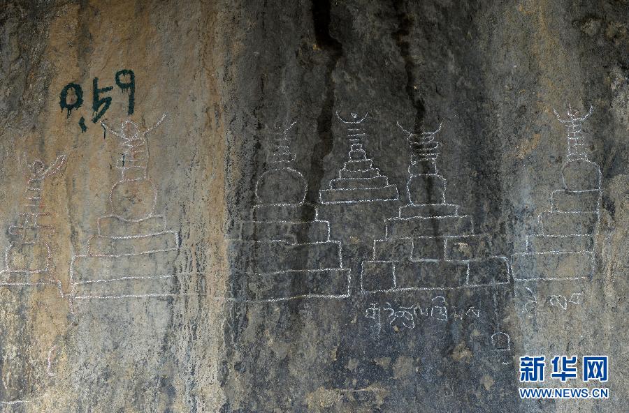 这是在西藏林芝地区工布江达县太昭村唐蕃古道遗址中的肺崖洞内拍摄的佛塔岩画(局部)(3月24日摄)。在西藏林芝地区工布江达县太昭村,有一条唐蕃古道遗址。据记载,1300多年前,文成公主前往拉萨经过此地。沿唐蕃古道向上爬,一路上能看到山上刻有许多藏文,并涂有朱红颜料,这些藏文绝大部分是六字真言“唵嘛呢叭咪吽”,祈祷行人吉祥如意、一帆风顺。新华社记者 刘东君 摄