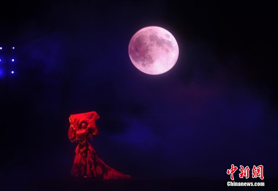 4月1日晚,世界首部改编自文学巨匠沈从文原著的大型实景演出《边城》在湖南凤凰古城森林剧场举行唯美首演。据悉,这部耗资1.8亿元人民币打造的实景演出,将围绕《边城》展开摄影史上最高的一笔100万单项奖金的摄影大赛。图为身着嫁衣的翠翠。 杨华峰 摄