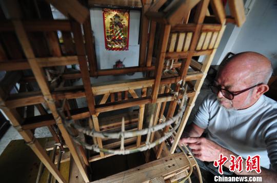 4月1日,75岁高龄的柳州市级非遗传承人朱明先在家中制作花炮台。 龚普康 摄