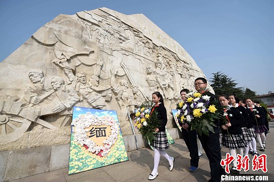 4月1日,合肥市翠庭园小学学生在大蜀山烈士陵园烈士纪念碑前准备进献花篮。中新社发 韩苏原 摄