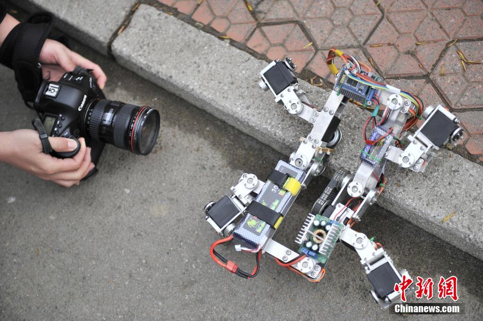 4月1日,天津大学学子在操控“第三代多足变胞爬行机器人”跨越障碍。据了解,该款机器人可通过手机无线遥控,将根据环境变化和任务需求进行灵活变形,适应各种狭窄弯道及地面条件,且运动方式与自然界中爬行动物类似,在航空航天、地质勘探以及抢险救灾等领域有着重要应用。中新社发 佟郁 摄