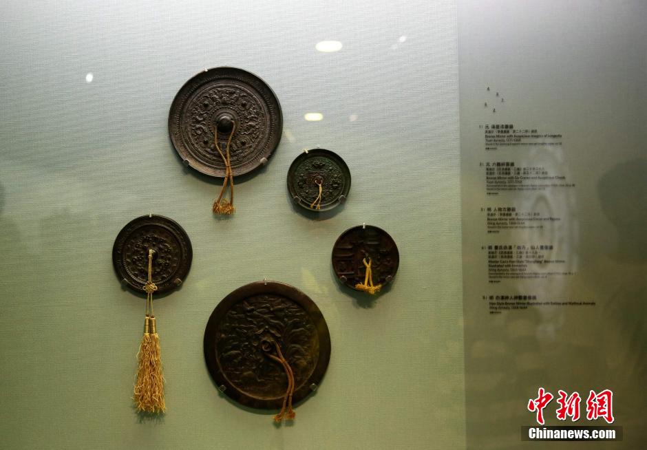 4月1日,台北故宫博物院内展出的“皇帝的镜子”。展览从院方收藏的约400面镜子中精选出70余件大小不一的古镜,分三个单元展出,呈现了清宫皇帝收藏的汉代至明代古镜近两千年的发展历史。3月31日起,台北故宫连续推出“皇帝的镜子——清宫镜鉴文化与典藏”、“十指春风——缂绣与绘画的花鸟世界”、“毫素风采——明末清初的女性绘画”等三个特展。中新社发 陈小愿 摄