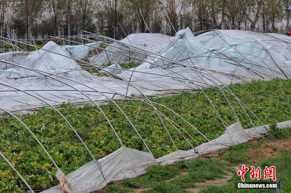 4月1日,山西永济迎来大风天气,农民在田地整理受损的塑料大棚。据中央气象台官网显示,运城市气象台2015年4月1日10时5分发布大风蓝色预警信号,预警区域内平均风力为5至6级,阵风7级以上,预计未来24小时大风天气仍可能持续。中新社发 钟欣 摄