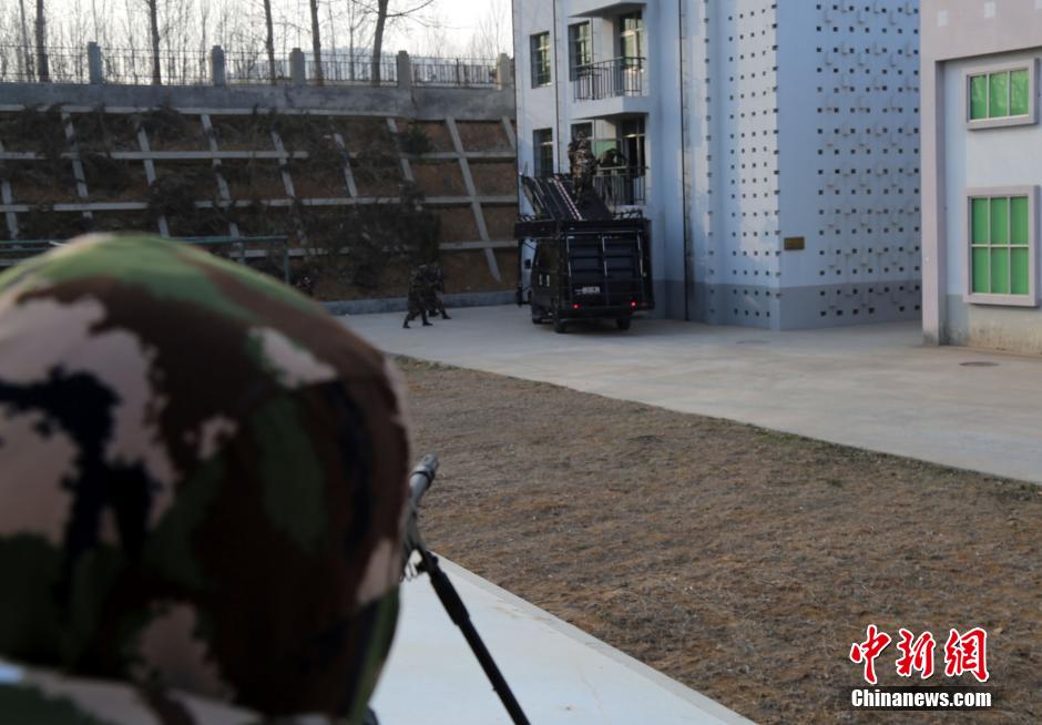 3月31日,武警烟台支队的战士们在训练基地举行了一场实弹反恐演习,突击队员使用反恐突击车、软管窥镜、震爆弹等装备制服“暴徒”,并成功解救了“人质”。杨磊 摄