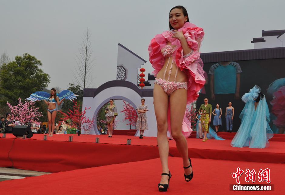 4月1日,以“大美阳山·乐活田园”为主题的2015中国·无锡第十九届阳山桃花节在惠山区阳山镇举行。活动中,一众美女身着比基尼表演《农耕年华》创意服饰秀,这些比基尼女郎与阳山镇的农家小院、花岛景观等田园风光相得益彰,引来大批游客驻足观看。据悉,阳山镇是中国著名的水蜜桃之乡,每年桃花盛开之时,当地政府都会举办庆祝活动,邀请四海宾客赏桃花美景、吃农家饭菜、寻世外桃源。孙权 摄