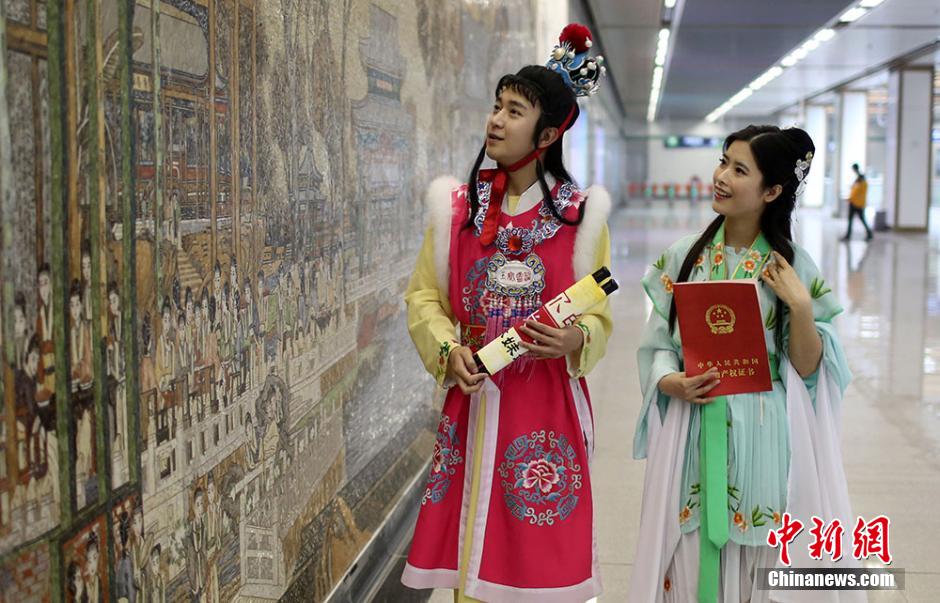 4月1日,南京地铁3号线正式开通,在29座车站中,有9座车站的文化墙是以红楼梦为主题,因此3号线也被称为“红楼线”。贾宝玉和林黛玉无疑是红楼梦中最广为人知的主角。当天,在紫荆国际公寓卡子门地铁站,“贾宝玉”手捧写有贾宝玉和林黛玉二人名字的不动产权证,高呼求婚口号:“去你的大观园,来我的小紫荆!林妹妹,嫁给我吧!”,引发市民围观。泱波 摄