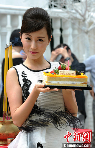 4月1日,香港明星刘心悠出席电影《我老婆系明星》宣传活动。当天是刘心悠34岁的生日,电影公司特别送她生日蛋糕。中新社发 谭达明 摄