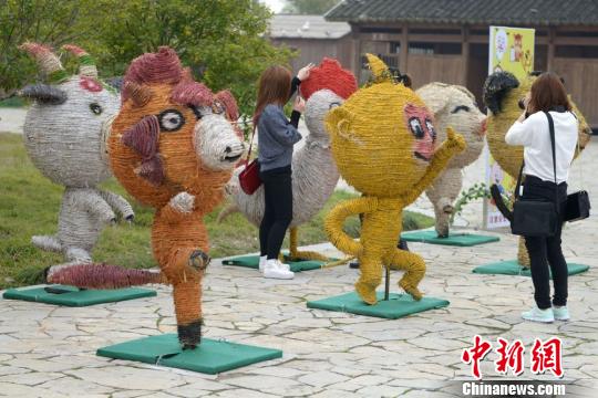4月1日,“第六季稻草人奇幻春游之旅”在江苏苏州太湖国家湿地公园开幕,造型各异的稻草人妙趣横生,吸引了不少市民和游客的目光。据悉,此次活动将持续至6月15日。图为游客被十二生肖稻草人所吸引。 王思哲 摄