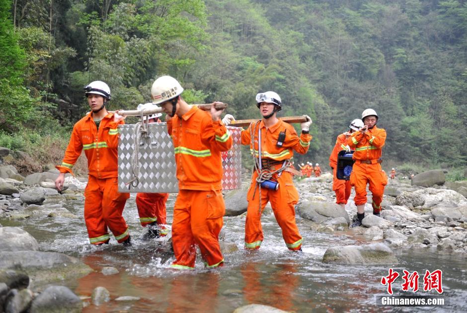 图为消防官兵抬着重达300多斤重的救援设备赶赴灾区。 刘忠俊 摄