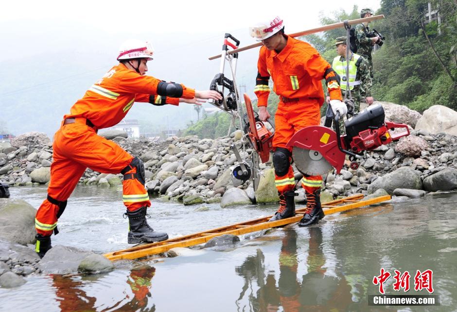 图为消防官兵携带重型装备过河。 刘忠俊 摄