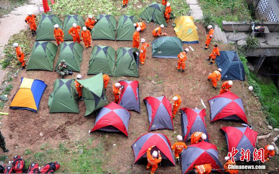 图为消防官兵正在进行帐篷搭建。 刘忠俊 摄