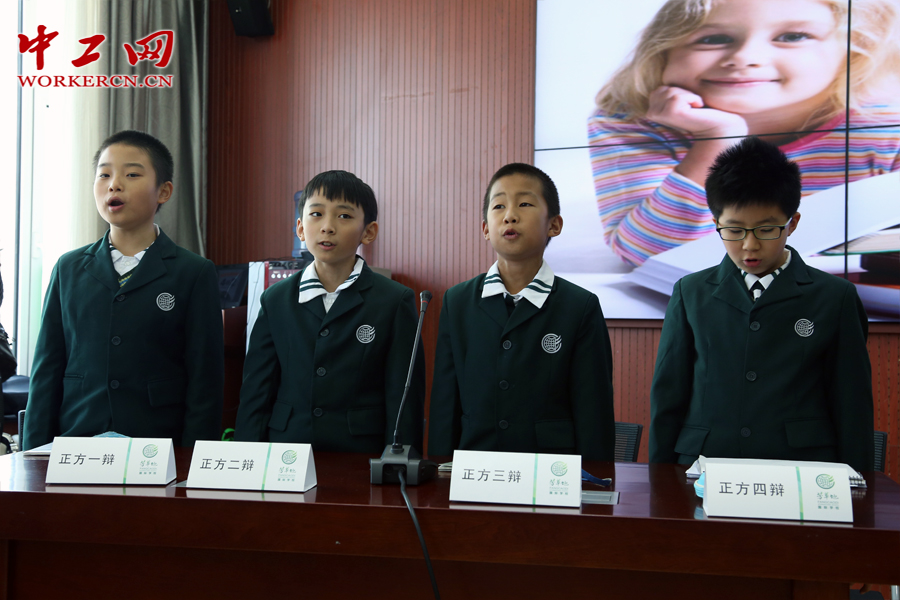 4月2日是“世界儿童阅读日”、“中国儿童阅读日”,在这个特殊的日子,芳草地国际学校的知行辩论社团正式成立了。芳草地国际学校刘飞校长为辩论社团揭牌,揭牌仪式后,芳草地国际学校学生发起的辩论联谊赛火热开战。来自四年级的八名辩手就关注的焦点问题“小学生出国留学利与弊”展开了激烈的辩论。   (中工网记者  毛邓摄)