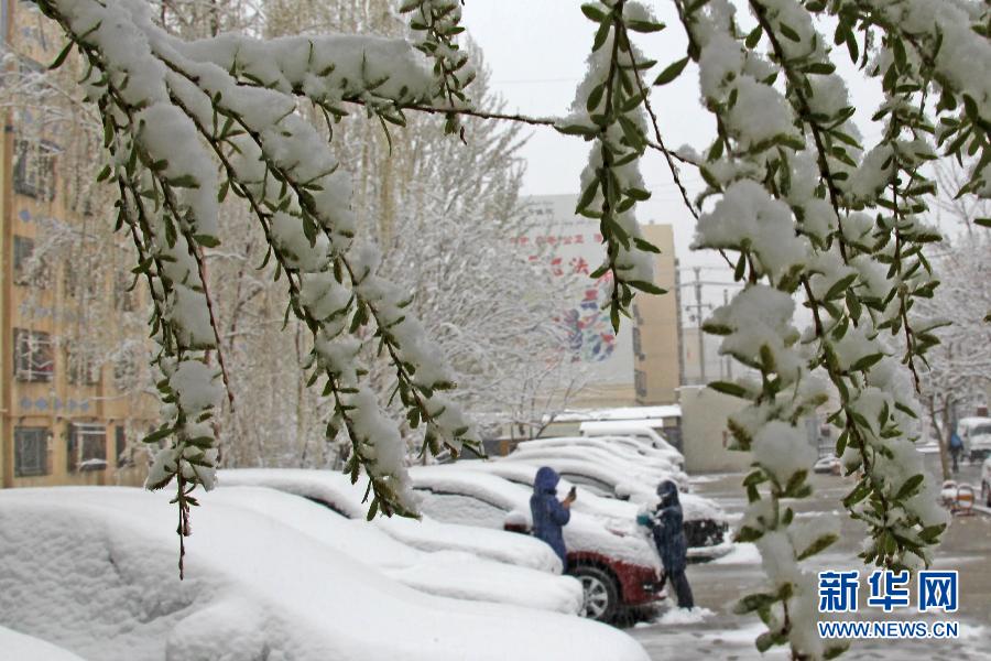 4月3日,行人在新疆哈密街头驻足玩雪。新华社发(蔡增乐 摄)