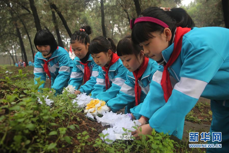 4月3日,在河南省平顶山市宝丰县烈士陵园,小学生们在向烈士敬献纸花。 新华社发(何五昌 摄)