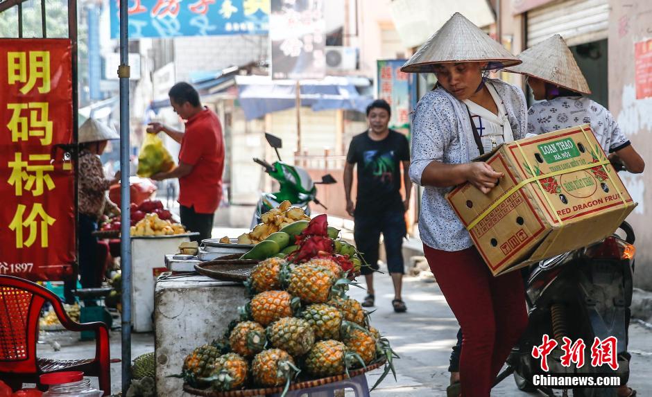 4月3日,一位越南商贩在云南省河口市中越边境附近卸下水果,这个摊位写着“明码标价”的广告。中新社发 张浩 摄