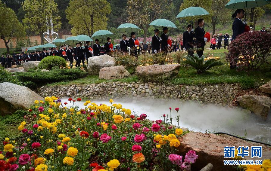 4月3日,武汉首届集体环保葬礼仪队伍到达落葬现场。