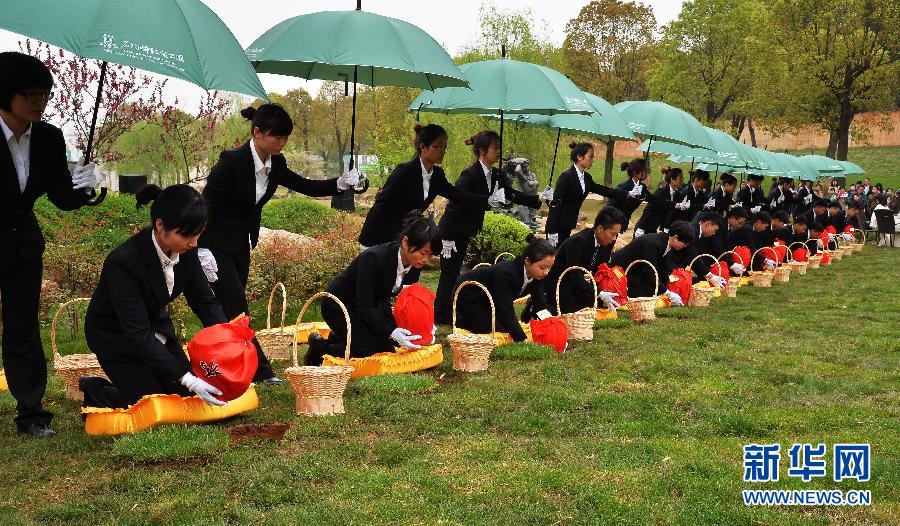 4月3日,武汉首届集体环保葬的安葬礼仪师将骨灰安放进墓穴。新华社发(胡伟鸣 摄)