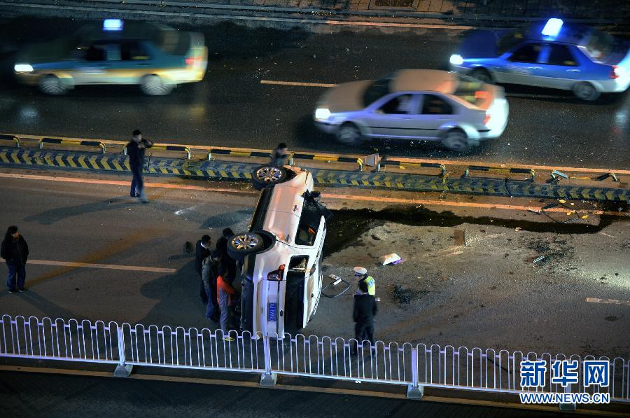 长沙:车撞隔离墩 横躺路中央