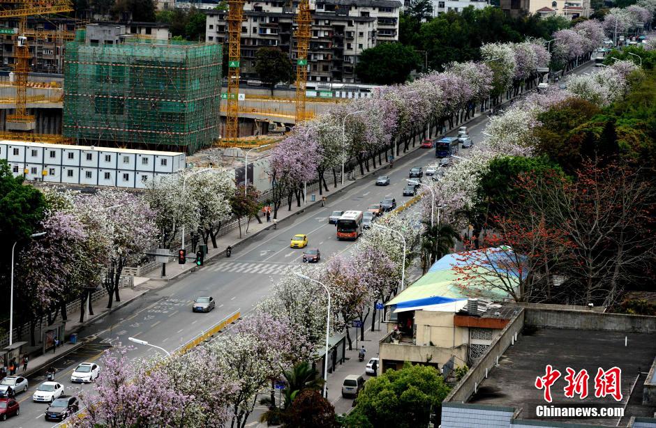 4月7日,福州有名的景观树羊蹄甲花朵盛开,在福州金泉路、温泉支路、朝阳路、高桥路等多条市区主干道,红白相间的花朵布满枝头,马路变身“花道”,扮靓了福州。中新社发 王东明 摄