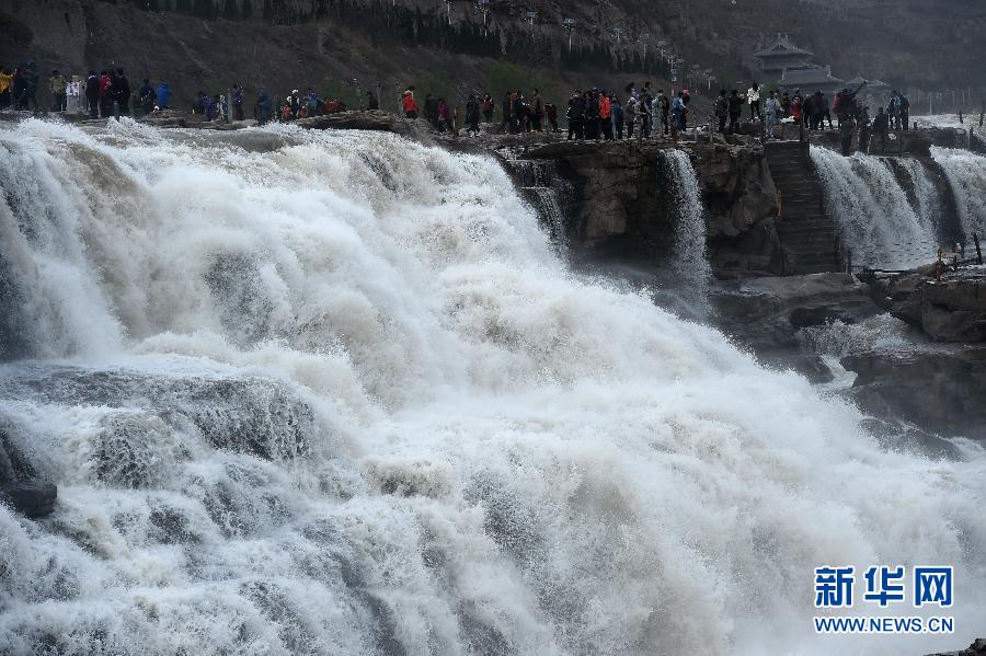 游客在参观壶口瀑布(4月12日摄)。进入春季以来,位于山西吉县和陕西宜川县交界的黄河壶口瀑布水流增大,形成奔腾汹涌、蔚为壮观的瀑布群,吸引了众多游客前来观光。新华社记者燕雁摄