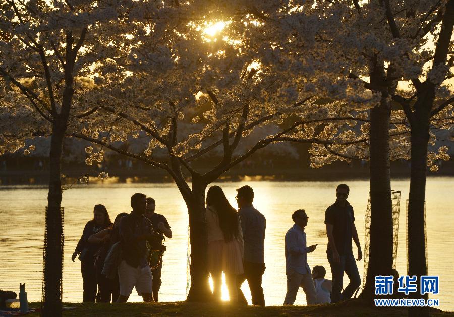 4月12日,游客在美国首都华盛顿的潮汐湖畔观赏樱花。华盛顿潮汐湖畔的数千株樱花正值盛放期,吸引了大批游客。 新华社记者殷博古摄