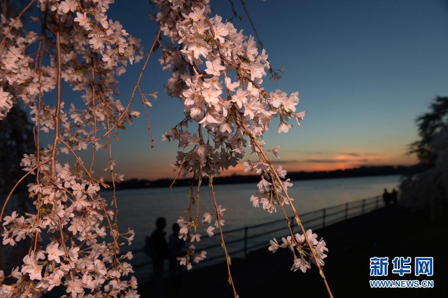 4月12日,游客在美国首都华盛顿的波托马克河边观赏樱花。 华盛顿潮汐湖畔的数千株樱花正值盛放期,吸引了大批游客。 新华社记者殷博古摄