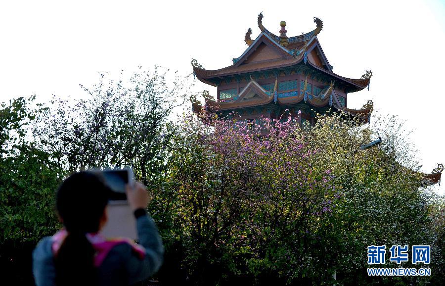 4月14日,一名路人在福州用平板电脑拍摄被各色盛开羊蹄甲花朵围绕的西禅寺。近日,福州市区多条道路两侧和城市公园内的羊蹄甲树进入花期,花朵盛开,春意盎然。 新华社记者魏培全摄