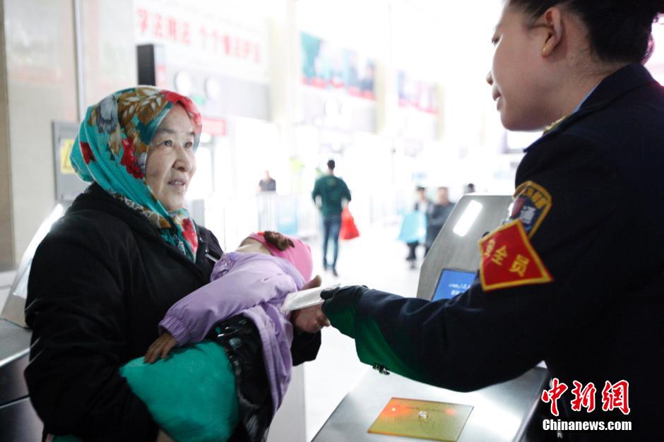 图为车站工作人员向乘客耐心讲解系统使用方法。 中新社发 王小军 摄