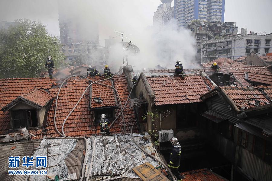 4月17日,消防队员在武汉同兴里民居火灾现场灭火。当日,武汉汉口车站路同兴里一栋建于20世纪二十年代的建筑突发火灾,武汉消防部门派出10余辆消防车赶往现场扑救,一个小时后大火被扑灭。事故没有造成人员伤亡。新华社发