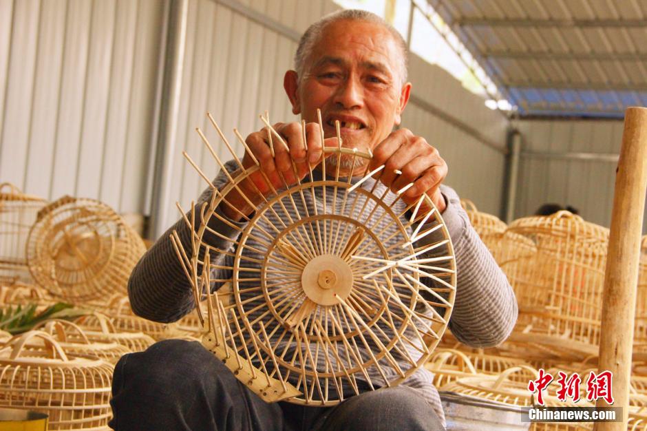 4月17日,被称为“鸟笼村”的广西柳江县百朋镇新圩场上百户人家正在制作鸟笼,塑型、安装插条、固定底座、穿丝、浸泡油漆等近百道工序村民手中进行着。这里每月可生产鸟笼4万多个,每年有超过50万个鸟笼销往全国各地,以平均售价20元计算,年产值约1千万元。朱柳融 摄