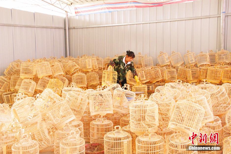 4月17日,被称为“鸟笼村”的广西柳江县百朋镇新圩场上百户人家正在制作鸟笼,塑型、安装插条、固定底座、穿丝、浸泡油漆等近百道工序村民手中进行着。这里每月可生产鸟笼4万多个,每年有超过50万个鸟笼销往全国各地,以平均售价20元计算,年产值约1千万元。朱柳融 摄