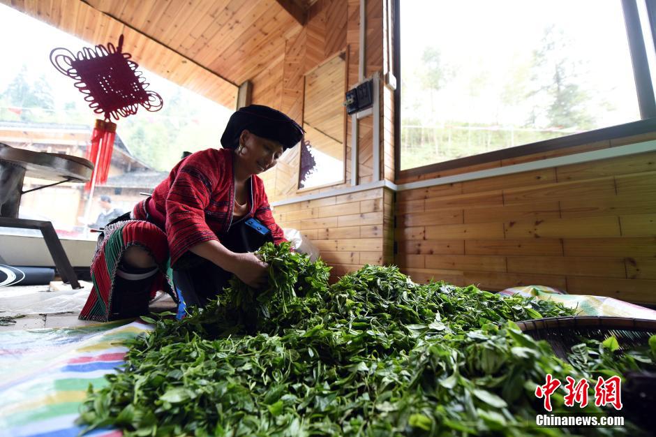 4月20日,在广西龙胜各族自治县龙脊镇中禄村,当地的瑶族群众在制作“谷雨茶”。当日是农历“谷雨”节气,广西龙胜各族自治县龙脊镇中禄村的瑶族群众上山赶采“谷雨茶”。“谷雨茶”是谷雨时节采摘的春茶,又叫二春茶,茶叶色泽翠绿,富含多种维生素和氨基酸,用其泡出来的茶滋味鲜活、香气怡人。中新社发 韦吉阳 摄