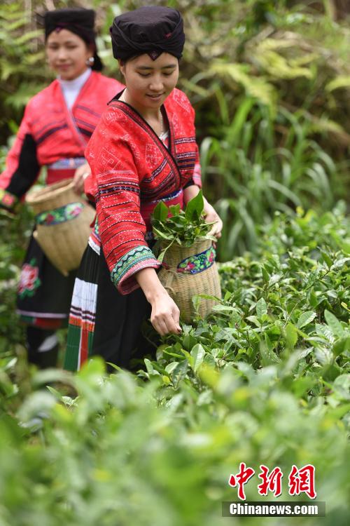 4月20日,在广西龙胜各族自治县龙脊镇中禄村,当地的瑶族群众在生态茶园采摘“谷雨茶”。当日是农历“谷雨”节气,广西龙胜各族自治县龙脊镇中禄村的瑶族群众上山赶采“谷雨茶”。“谷雨茶”是谷雨时节采摘的春茶,又叫二春茶,茶叶色泽翠绿,富含多种维生素和氨基酸,用其泡出来的茶滋味鲜活、香气怡人。中新社发 韦吉阳 摄