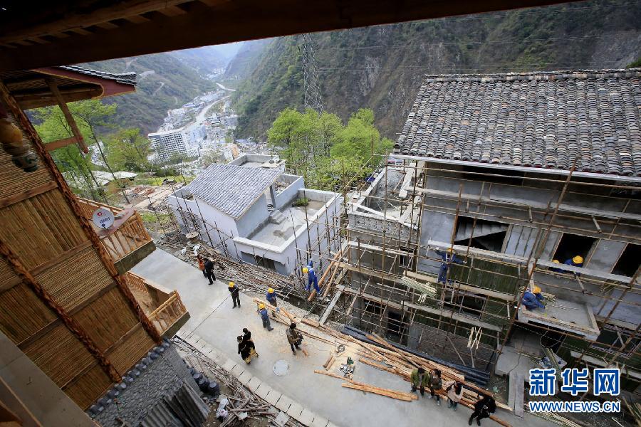 4月9日,工人们在宝兴县穆坪镇雪山新村加紧建设房屋。 “4·20”芦山地震后,四川省雅安市宝兴县穆坪镇雪山新村的灾后重建设计规划由中国扶贫基金会牵头,面向全球发布了以重建复兴为主题的设计竞赛,为灾后重建汇聚了众多优秀设计方案和创意。入选方案按照“阳台晒坝、前庭后院;穿斗结构,座脊加盖;鸡犬相闻、圈舍分离;栽瓜种菜,宜居宜业”的风格,充分尊重农村生产生活习俗,结合灾后重建和产业发展,将雪山新村打造为以生态农业和乡村旅游业为主导的休闲旅游民俗度假村。新华社记者 李明放 摄