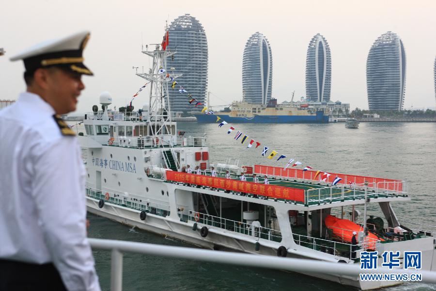 4月21日,一艘海巡船上的船员注视着另一艘海巡船离开三亚港口。当日,海南海事局“海巡21”和“海巡1103”船舶编队从三亚起航开赴西沙,开展为期3天的西沙海域巡航执法行动,此次巡航主题是“保障航行安全,保护海洋环境,维护国家海洋权益”。巡航期间将有水上飞机参与,这是在西沙海域首次开展有水上飞机参与的海空联合巡航执法行动。新华社记者 郭求达 摄