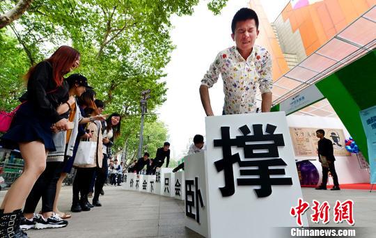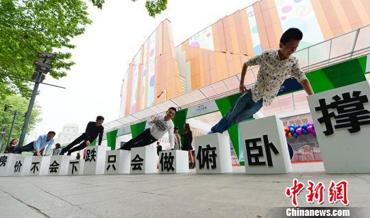 4月24日,在南京水游城广场上举办的春季房展会上,几位工作人员在“房价不会下跌,只会做俯卧撑”的标牌上做起了俯卧撑,以此来吸引过往路人的目光。