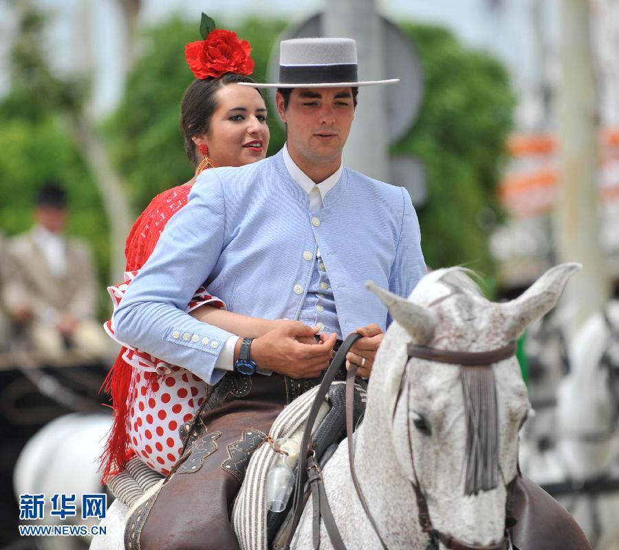4月24日,在西班牙塞维利亚,一对情侣骑马参加“四月节”庆祝活动。每年4月,塞维利亚都要迎来传统节日“四月节”。源于1847年的“四月节”又称“四月集市周”或“四月集”,曾是当地一年一度的牲畜交易会,如今已演变为安达卢西亚地区最著名的民间节庆与文化盛会。参加“四月节”的男女都以漂亮的传统服装打扮自己。新华社记者谢海宁摄