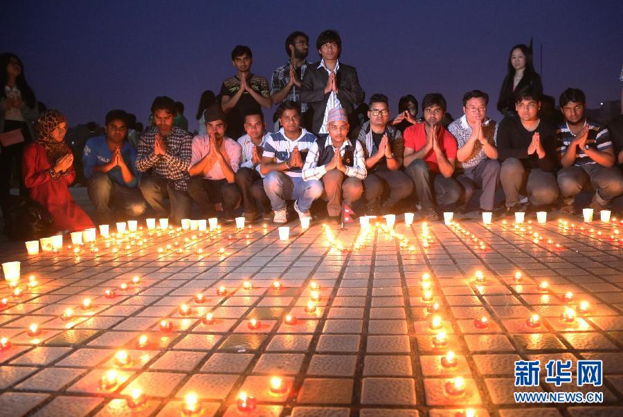 4月26日,在湖南衡阳南华大学,来自该校国际学院的外国留学生点亮烛光为尼泊尔地震受灾民众祈福。当日,湖南衡阳南华大学举办烛光祈福会,为尼泊尔地震受灾民众祈福。 新华社发(曹正平 摄)