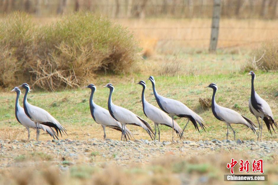4月28日,一群蓑羽鹤在哈巴河县一处退耕还林地旁觅食、嬉戏、飞翔。近年来,新疆哈巴河县逐年加大对环境保护建设投入力度,每年迁栖至哈巴河县境内繁衍生息蓑羽鹤也在逐年增多。4月28日,一群蓑羽鹤在哈巴河县一处退耕还林地旁觅食、嬉戏、飞翔。刘是何 摄