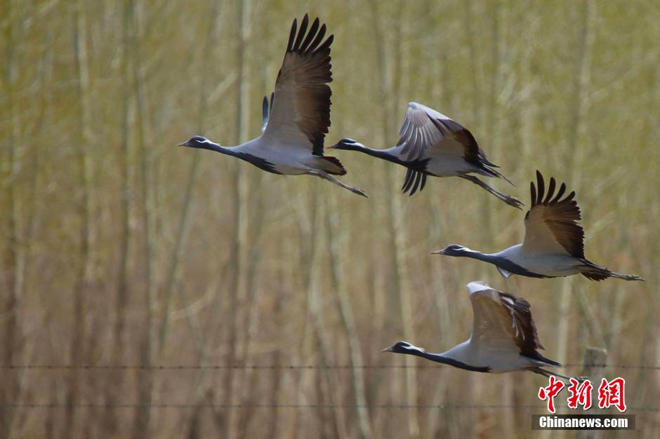 4月28日,一群蓑羽鹤在哈巴河县一处退耕还林地旁觅食、嬉戏、飞翔。近年来,新疆哈巴河县逐年加大对环境保护建设投入力度,每年迁栖至哈巴河县境内繁衍生息蓑羽鹤也在逐年增多。4月28日,一群蓑羽鹤在哈巴河县一处退耕还林地旁觅食、嬉戏、飞翔。刘是何 摄